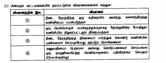 (c) பிழையான நிலைப்பாட்டுடன் (posture) கணினிகளைப் பயன்படுத்துவதனால் ஏற்படத்தக்க இரு உடனல் விளைவுகளைச் சுருக்கமாக விளக்குக.