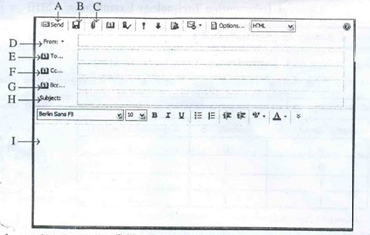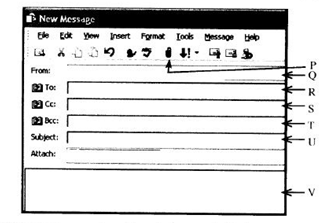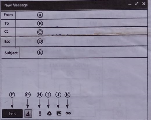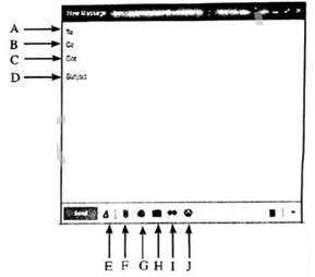 (b) அஸ்மா யால தேசிய பூங்காவிற்கு அண்மையில் சென்றபோது யானைக் கூட்டம் ஒன்றின் ஓர் ஒளிப்படத்தை எடுத்துள்ளார். அவர் தனது நண்பர்களுடன் தனது அனுபவத்தையும் ஒளிப்படத்தையும் மின்னஞ்சலினூடாகப் பகிர்ந்து கொள்வதற்கு விரும்புகின்றார். அவர் வலப் பக்கத்தில் காணப்படும் உருவை ஒத்த ஒரு புதிய மின்னஞ்சல் சாளரத்தைத் திறந்துள்ளார். மின்னஞ்சல் சாளரத்தில் காட்சிப்படுத்தப்பட்டுள்ள புலங்களும் படவுருக்களும் A தொடக்கம் என முகப்படையாளம் (Label) இடப்பட்டுள்ளன.