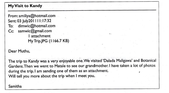(இ) சமிதா, முத்துவுக்கு தனது சமீபத்திய கண்டி பயணத்தைப் பற்றி மின்னஞ்சல் அனுப்பினார், மேலும் மதுரா என்ற மற்றொரு நண்பருக்கு ஒரு பிரதியை அனுப்பினார். பயணத்தின் போது எடுக்கப்பட்ட புகைப்படத்தையும் சமேதா இணைத்துள்ளார். அவர் அனுப்பிய மின்னஞ்சலின் ஒரு பகுதி கீழே உள்ளது.