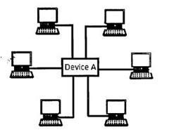 (b) உ.மர் உருவில் காணப்படுகின்றவாறு ஒரு சிறிய அறையில் ஆறு கணினிகளைக் கொண்டு ஒரு கணினி வலையமைப்பை ஏற்படுத்துகின்றான். அவன் கணினிகளினுள்ளே நிலைப்படுத்தப் பட்ட இடைமுகக் கூறு B யினூடாகக் கணினிகளுக்குச் சாதனம் A யைத் தொடுப்பதற்குக் கவசமிடாத முறுக்கிணை (UTP) வடங்களைப் பயன்படுத்துகின்றான்.