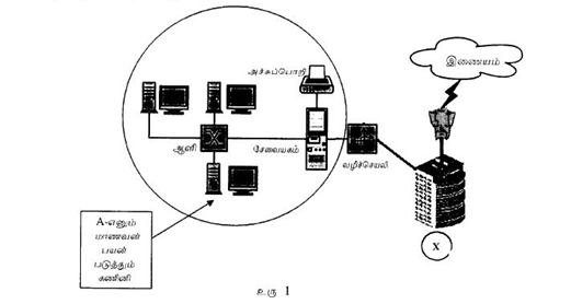 (a) ஒரு பாடசாலையின் கணினி ஆய்கூடத்திலுள்ள கணினிகள் எவ்வாறு இணையத்துடன் தொடுக்கப்பட்டுள்ளன. என்பதை உரு 1 சுட்டிக்காட்டுகின்றது.