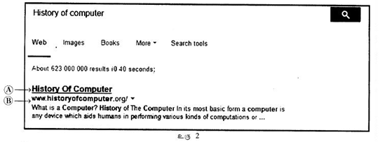 (b) மாணவன் ஒருவன் ‘கணினியின் வரலாறு (History of computer)’ பற்றிய தகவல்களை இணையத்தில் தேடியபோது கிடைத்த பெறுபேற்றினைக் காட்டும் திரையின் (screenshot) ஒரு பகுதியை கீழேயுள்ள உரு 2 காட்டுகிறது.