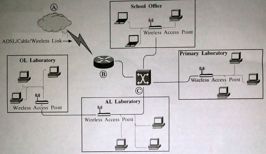 (a) வெளி உலகுடன் தொடுக்கப்பட்ட ஒரு பாடசாலைக் கணினி வலையமைப்பின் ஒரு பகுதி பின்வரும் வரிப்படத்தில் காணப்படுகின்றது. A,B, எனக் குறிப்பிடப்பட்டுள்ள உருப்படிகளை இனங்கண்டு, எழுதுக.